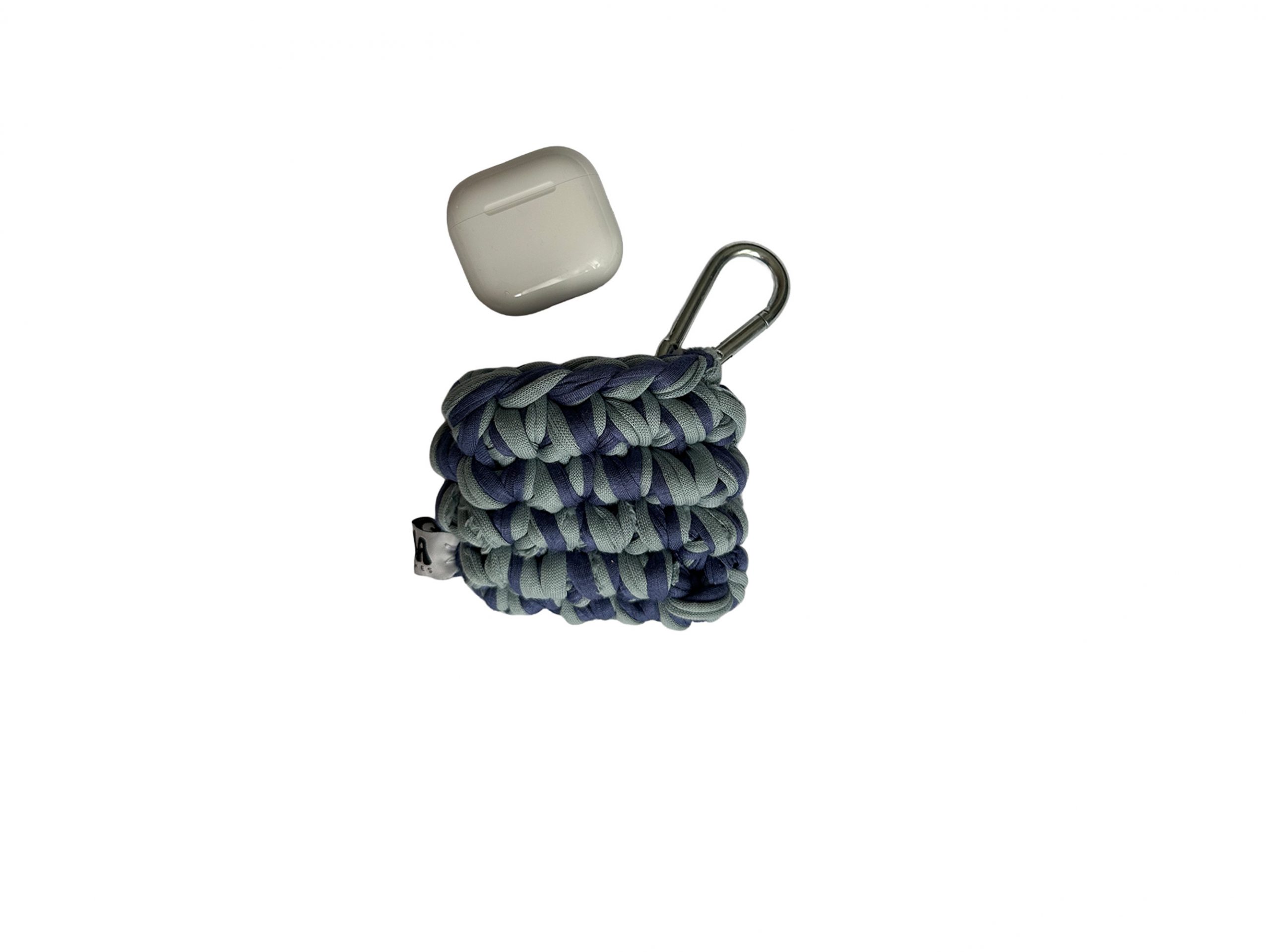 Handgehäkelte Airpod Hülle aus recyceltem T-Shirt-Garn (100 % Baumwolle) mit Karabiner, elastisch und als einzigartiges Unikat gefertigt.