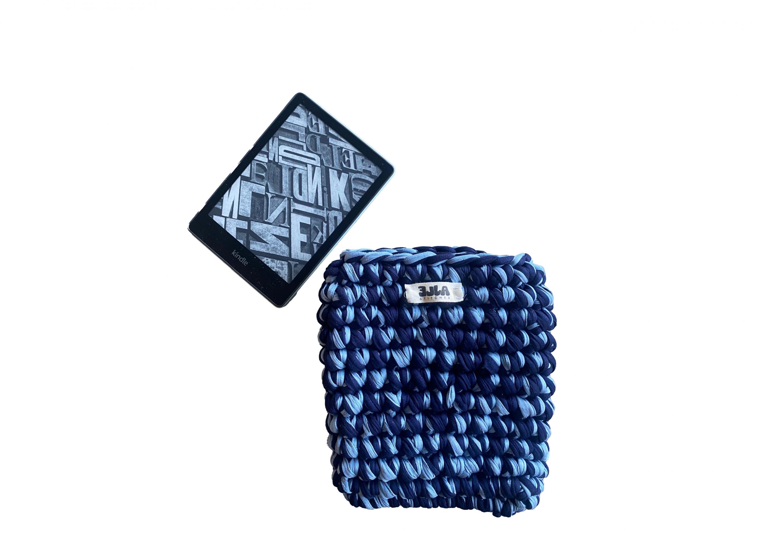 Handgehäkelte E-Reader Hülle aus recyceltem T-Shirt-Garn (100 % Baumwolle) mit Karabiner, elastisch und als einzigartiges Unikat gefertigt.